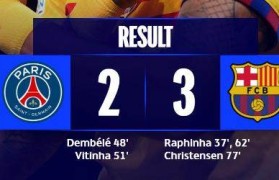 体坛周报全媒体原创 巴黎圣日尔曼2比3巴塞罗那 48'登贝莱,50'维蒂尼亚/37'拉菲尼亚,6...